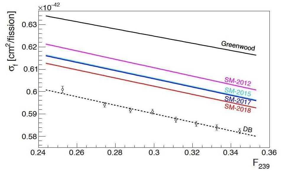 Légende : En 2011 le modèle de sommation (Greenwood) alors compatible avec le modèle de conversion prévoyait 6% d’antineutrinos de plus que ce qui était mesuré par Daya Bay (DB). L’amélioration du modèle nucléaire en 2012, 2015, 2017 puis 2018 grâce aux données TAGS a permis de réduire l’écart à 2%. Figure M. Estienne et al. Phys. Rev. Lett. 123 (2019) 022502.
